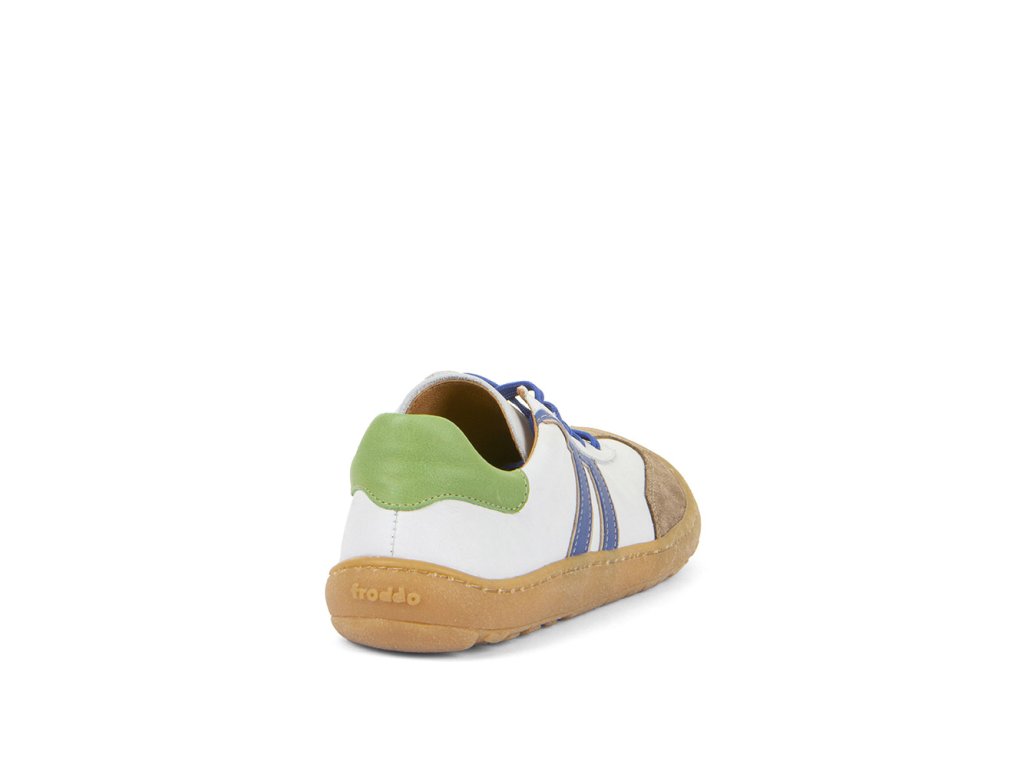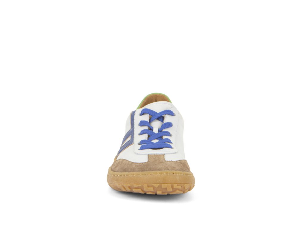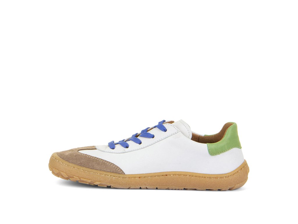 The Froddo F-Motion White Blue combines sporty retro style with barefoot functionality. The upper features smooth white leather paired with earthy green and brown tones, while the toe cap is velour leather for added texture and style. Designed for regular-width feet, these shoes provide comfort without compromising on flexibility.